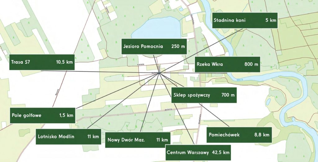 W niedalekim Pomiechówku – oddalonym o kilka kilometrów – dostępne są wszystkie niezbędne usługi: sklepy, restauracje, szkoły, przedszkola oraz placówki medyczne. Pomiechówek słynie także z atrakcji rekreacyjnych, takich jak park linowy czy przyrodniczo-edukacyjny park „Dolinka Wkry”, idealny na rodzinne spacery i aktywne spędzanie czasu na świeżym powietrzu.